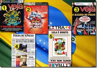 Trois semaines de suite, en septembre, Veja se déchaîne contre Lula (“supion” en portugais), surnommé “le poulpe”. Ici, le poulpe menace de tout engloutir : 1 Le service public : “Le parti du poulpe”. 2 L’argent des contribuables : “Le poulpe au pouvoir”. 3 Le palais présidentiel : “La joie du poulpe”. 4 A la une de Folha de São Paulo du 5 septembre, “Par la faute de Dilma, les consommateurs devront payer 1 milliard de reais”. 5 A la une d’Extra, le 1er septembre : “Lula est super”. Un titre ironique, alors que l’article est à charge.